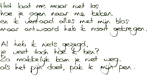 Wouw….. dit gedicht zou ik maar wat graag aan iemand geven, jij weet wel wie ;) Spot on, echt waar!